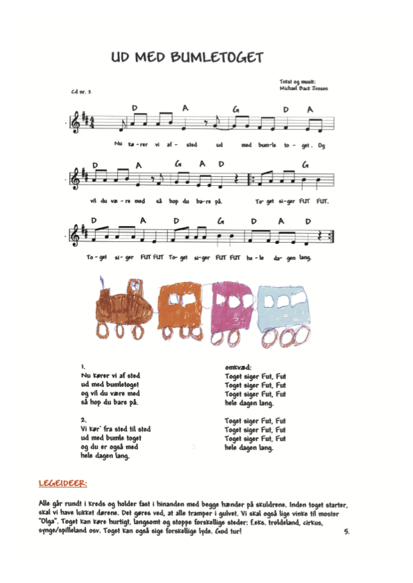 Sjov iørefaldende bevægelsessang, hvor børnene leger, at de kører med tog. Sangen er for børn i alderen 1-6 år og gentagelser og lyde gør, at sangen er let at synge med på og stimulerer fantasi, rytme, leg, fællesskab og samarbejde. Ud med bumletoget er fra udgivelsen “Op på tæerne” (år 2000).